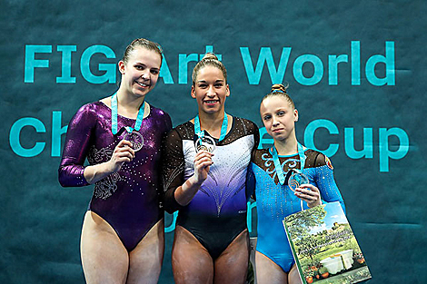 Aliaksandra Varabyova took the bronze on uneven bars with 11.950 points. The gold went to Hungary’s Zsofia Kovacs (14.000). Jasmin Mader from Austria won the silver (12.500).