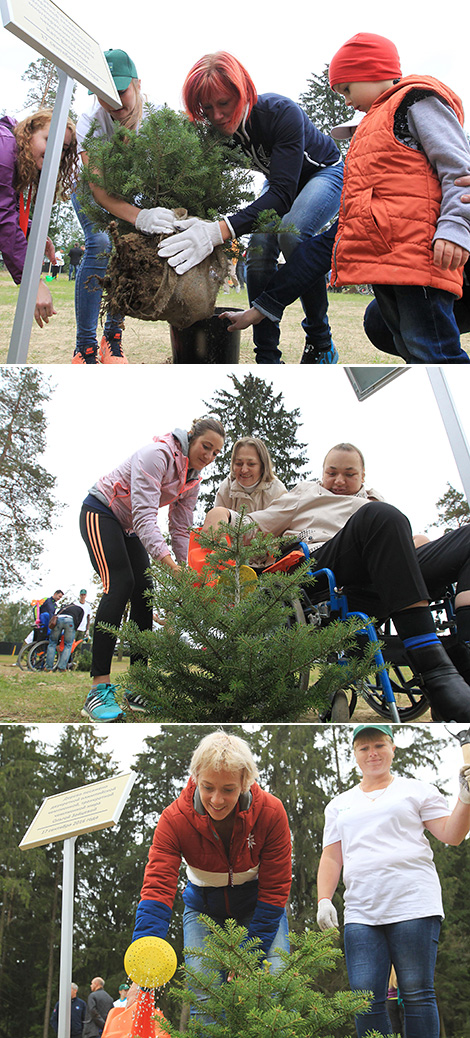Kati Wilhelm, Marie-Laure Brunet and Olga Zaitseva plant the trees in Legends' Park