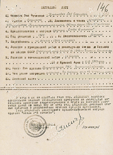 Senior Sergeant Khodanovich received the Order of Glory, 2nd Class after the liberation of Belarus. On the night of 1 December 1944, he and his group carried out a daring raid, penetrating the enemy’s forward line of defense. The Germans did not even have time to understand what was happening when grenades were thrown into their dugout. During this raid, Lev Khodanovich personally destroyed a heavy machine gun and captured two prisoners.