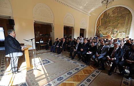 Ambassador Extraordinary and Plenipotentiary of Azerbaijan to Belarus Latif Gandilov emphasized the topicality of Imadaddin Nasimi’s many ideas for the modern society. “The world we live in now gives a lot of reasons for worrying. Return to the ideas of Sufism and Hurufism that Imadaddin Nasimi shared is very important for us,” he said. As an example the ambassador mentioned the poet’s belief that man should set a limit for his desires instead of becoming a slave to them. The spiritual formula was expressed back in the 14th century. According to the diplomat, the modern generation should abide by this formula. “Abandon your desires and you will find truth. By rejecting the external, you will find truth inside yourself,” the ambassador quoted the poet as saying.