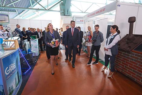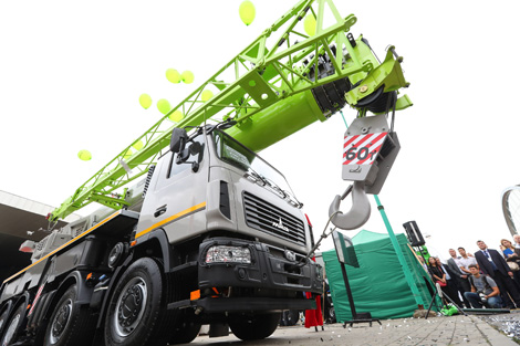 The vice premier studied the exhibits showcased at the international civil engineering expo Budpragres 2018. An automobile crane with the lifting capacity of 60 tonnes made by the Belarusian-Chinese joint venture OOO Zoomlion-MAZ was presented at the entrance to the Football Manege. The new automobile cranes are assembled at the Mogilevtransmash premises in Mogilev. The crane can lift 60 tonnes of weight as high as a 20-story building. Visitors were shown other big and small construction and road machinery.