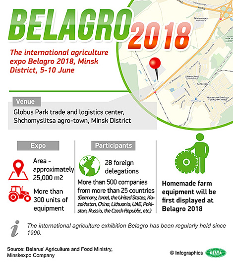 The international agriculture expo Belagro 2018 kicked off at the Globus Park trade and logistics center in the agro-town of Shchomyslitsa, Minsk District on 5 June. Taking part in the expo will be 536 companies from 28 countries, including Austria, the UK, Germany, Denmark, Spain, Italy, Poland, Russia, the United States, Ukraine, and Finland. Collective stands are showcased by the Agriculture and Food Ministry, Industry Ministry, the National Academy of Sciences of Belarus, Belgospishcheprom, Belkoopsoyuz, other ministries and agencies of Belarus. The expo also features expositions of the enterprises from the Czech Republic, India, Pakistan, and the Kirov Oblast of Russia.