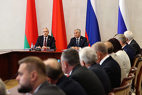 Igor Sergeyenko welcomed the participants to Mogilev. "85 years ago our ancestors held the defense of Mogilev against the Nazi hordes longer than some European countries. Today the situation is similar in many respects. We are facing the challenges that threaten the existence of both Belarus and Russia. As parliamentarians, we need to strengthen the positions of the Union State," he said. "We will discuss very important topics today. At a time of sanctions that the West has been churning out like a factory against Belarus and Russia the best response is to forge closer ties and productive interaction between the two countries, to improve the peoples' welfare and preserve the common historical memory."