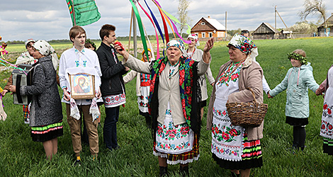 On the day of the rite, the inhabitants of Pahost dress up as in the old days and go to the field in a large procession, passing through the symbolic "gate of towels" on their way. The venerated icon of the Mother of God is at the head of the procession. It if followed by the "commander" with the ceremonial "round dance" bread. Next come the eight-pointed star and the green apron fastened to a wooden rake. All these symbols are entrusted only to men.