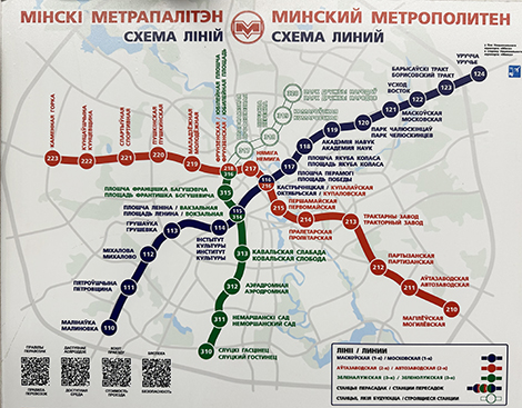 Charts of the Minsk metro lines are available in railway cars. Names of the stations are written in Belarusian and Russian.
