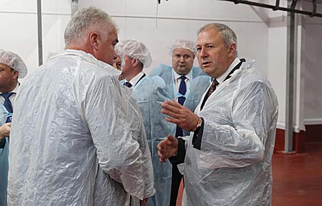 Николай Говорко рассказал, что предприятие работает всего пятый месяц, его производственная мощность составляет 1400 голов в смену. "Это датская генетика, беконная свинина первой категории," - уточнил он. Ежедневно предприятие отгружает 50 т охлажденной свинины в торговые сети и на мясоперерабатывающие предприятия Беларуси.