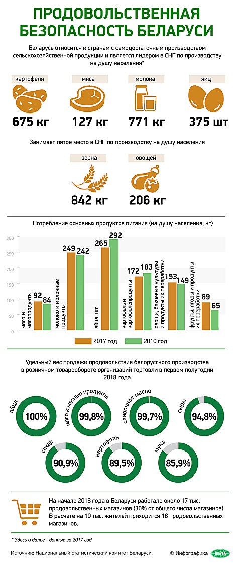 Беларусь относится к странам с самодостаточным производством сельскохозяйственной продукции. Продовольственная безопасность белорусов находится на высоком уровне и имеет положительную динамику. Страна лидирует в СНГ по производству на душу населения картофеля (в 2017 году - 675 кг), мяса (127 кг), молока (771 кг), яиц (375 штук). По среднедушевому производству зерна (842 кг) и овощей (206 кг) Беларусь занимает пятое место.