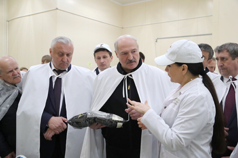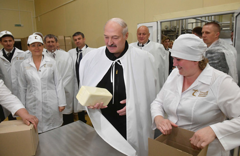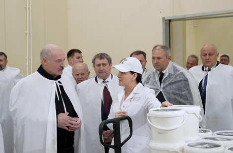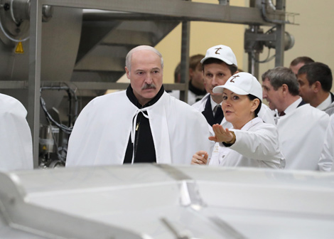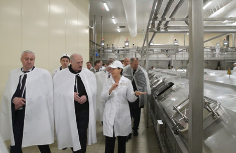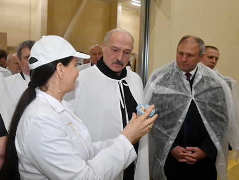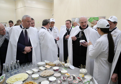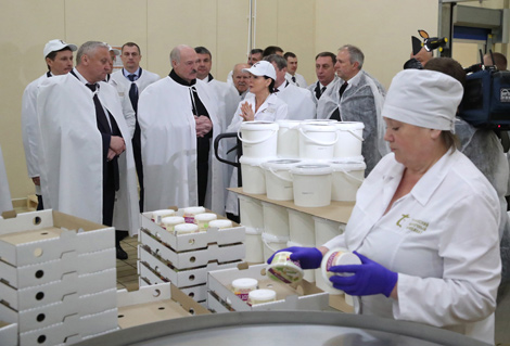 На Туровском молочном комбинате Президенту доложили о выполнении его поручений по увеличению мощности переработки молока, выпуску продукции с высокой добавленной стоимостью по новейшим технологиям в Беларуси в целом и в Гомельской области и на комбинате в частности.