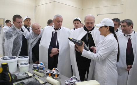 Главу государства также проинформировали о реализации инвестиционного проекта по запуску второй производственной мощности, производственно-технических характеристиках, финансово-экономическом состоянии и перспективах развития предприятия. Александр Лукашенко посетил несколько цехов комбината, ознакомился с современными технологическими процессами переработки молока, производимой и перспективной продукцией.