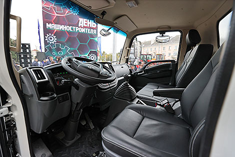 Новинка весит 7,5 т. Грузоподъемность машины - 4,8 т. Мощность - 150 л.с. Кабина у грузовика трехместная, в ней имеется кондиционер, отопитель с электронным управлением, стеклоподъемники и обогрев зеркал заднего вида, USB-розетки и многое другое. Сидение водителя оснащено подогревом, вентиляцией, а также подлокотником с регулировкой спинки.