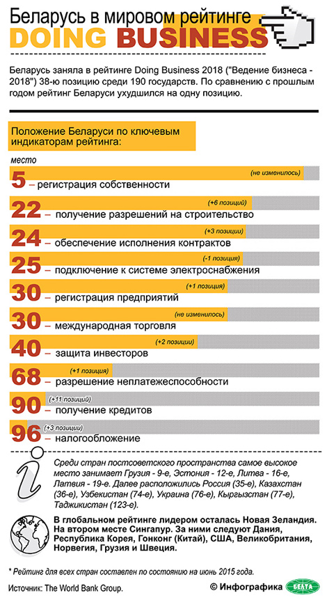 Как сообщалось, Беларусь заняла в рейтинге Doing Business - 2018 ("Ведение бизнеса - 2018") 38-ю позицию среди 190 государств, по которым проводится данное исследование. Согласно аналогичному отчету, опубликованному в октябре прошлого года, страна занимала 37-е место.