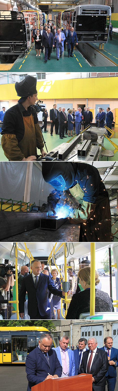 Во время посещения "Белкоммунмаша" Игорь Додон не только ознакомился с процессом производства городского пассажирского транспорта, но и проехал в качестве пассажира в новом электробусе модели Е433. Этот низкопольный электробус, рассчитанный на максимальную вместимость около 150 человек, оснащен системой видеонаблюдения. Президент Молдовы также оставил запись в Книге почетных гостей.