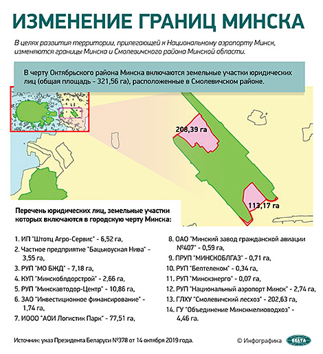 Как сообщалось, 14 октября глава государства подписал указ №378, согласно которому границы Минска и Смолевичского района Минской области изменяются в целях комплексного развития территории, прилегающей к Национальному аэропорту. В черту города будут включены земельные участки юрлиц общей площадью более 321 га, расположенные в Смолевичском районе. С 1 января 2020 года эти территории будут относиться к Октябрьскому району столицы.