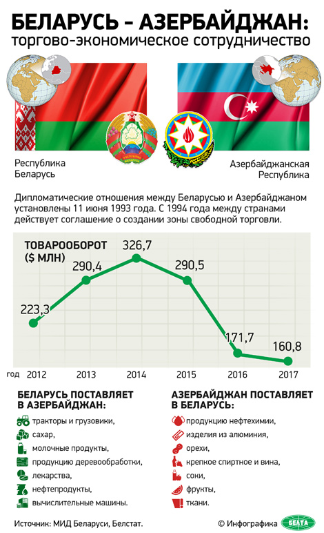 По итогам 2017 года товарооборот между Беларусью и Азербайджаном превысил $160 млн. Основные торговые позиции - тракторы и седельные тягачи, продовольствие, продукция деревообработки, лекарства, нефтепродукты.