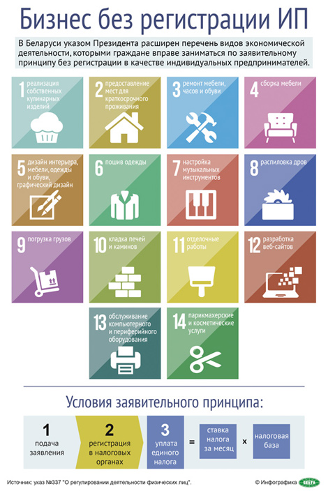 Президент Беларуси Александр Лукашенко 19 сентября 2017 года подписал указ №337 "О регулировании деятельности физических лиц". Документом расширяется перечень видов экономической деятельности, которыми граждане вправе заниматься без регистрации в качестве индивидуальных предпринимателей при условии уплаты единого налога.