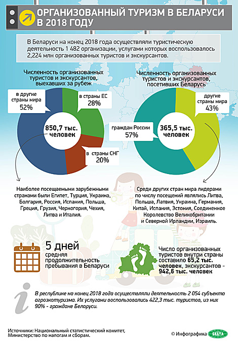 Наибольшее число прибывших организованных туристов и экскурсантов приходилось на российских граждан (57%). Среди других стран лидерами по числу посещений Беларуси являлись Литва, Польша, Латвия, Украина, Германия, Китай, Испания, Эстония, Великобритания, Израиль. Средняя продолжительность пребывания иностранных туристов в Беларуси в 2018 году составила 5 дней.
