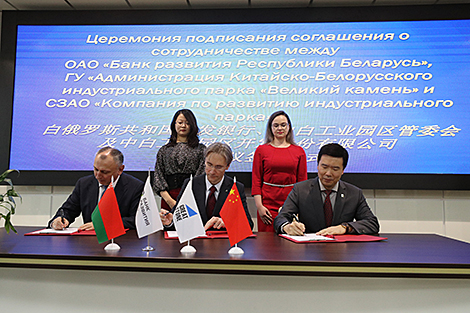 Подписи под документом поставили глава администрации парка "Великий камень" Александр Ярошенко, генеральный директор СЗАО "Компания по развитию индустриального парка" Янь Ган и председатель правления Банка развития Андрей Жишкевич.