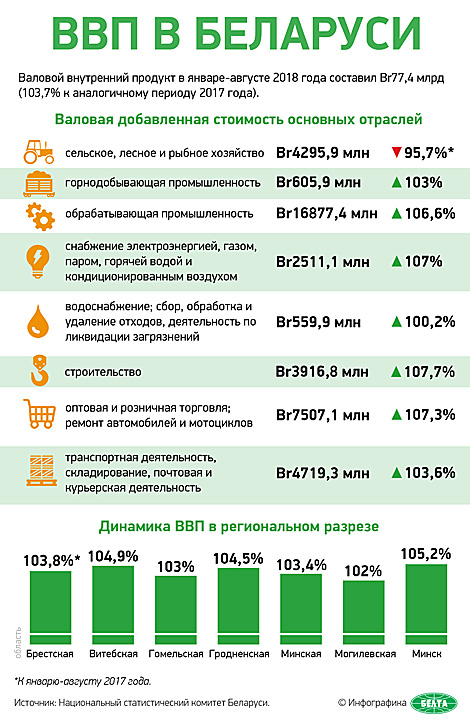 17 сентября Минск /Корр. БЕЛТА/. ВВП Беларуси в январе-августе 2018 года вырос на 3,7% по сравнению с аналогичным периодом прошлого года, сообщили БЕЛТА в Национальном статистическом комитете.