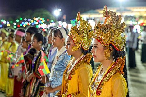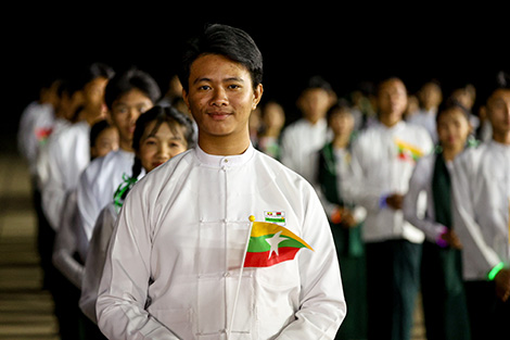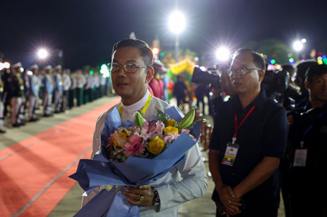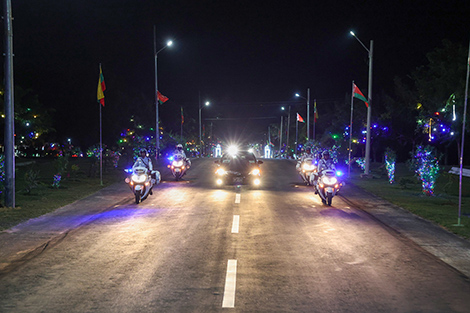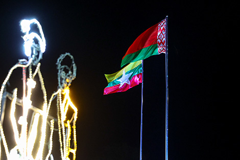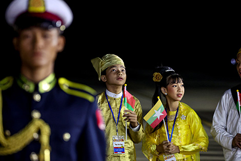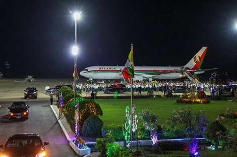 Борт Президента Беларуси приземлился в Международном аэропорту Нейпьидо. Воздушную гавань не только украсили государственной символикой Беларуси, но и придали ей национального колорита. На территории аэропорта появились многочисленные светодиодные фигуры людей с белорусскими и мьянманскими флагами в руках.