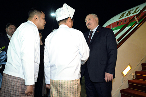 В аэропорту Александра Лукашенко встретили министр иностранных дел Беларуси Максим Рыженков, а также посол Беларуси во Вьетнаме и Мьянме (по совместительству) Владимир Боровиков. С мьянманской стороны главу белорусского государства встретил премьер-министр Ньё Со и другие официальные лица.