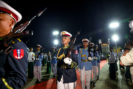 Белорусского лидера, который впервые прибыл с официальным визитом в Мьянму, приветствовали по-настоящему торжественно: у трапа развернули красную ковровую дорожку, вдоль которой выстроилась рота почетного караула. Здесь же собрались жители Мьянмы в ярких традиционных костюмах. Разумеется, с государственными флагами двух стран.