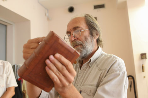 Работа над Евангелием 1600 года почти завершена, и о технологии реставрации мастер рассказывает практически на пальцах. Благо у него есть иллюстративный экземпляр.