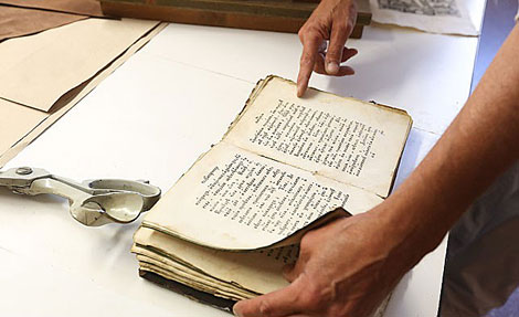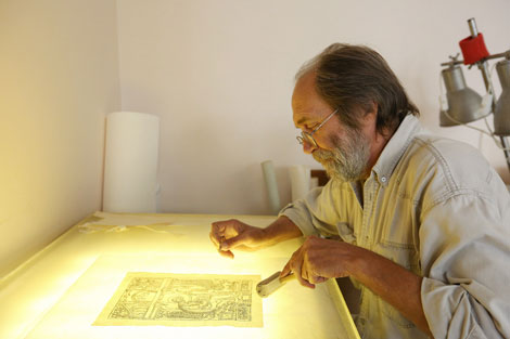 После на специальном столе с подсветкой реставратор склеивает парные листы по принципу тетради, укрепляет разрывы особой микалентной бумагой - незаметной глазу. Это дорогостоящий материал, сегодня такую бумагу можно приобрести лишь за границей. Клей мастер варит самый обычный, мучной, такой используют в реставрации, он не наносит вреда и обратим: при необходимости склеенные слои бумаги в воде разъединяются.