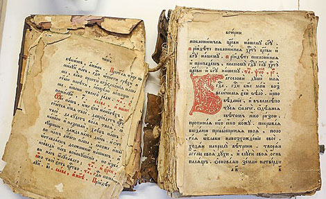 "Эта книга лет на 50-70 моложе отреставрированного Евангелия. Видите, страницы коричневые, с грязными разводами, затеками. Такие листы обычно в начале и в конце фолианта, в середине они лучше сохраняются. Церковные книги, поскольку использовались во время служб, сильно закапаны воском, который надо тщательно и осторожно счистить. Обложка здесь едва держится на единственном шнуре, рваный корешок, а часто книги приходят и вовсе без обложек. Листы начинают рассыпаться, теряются. К слову, с Евангелием повезло - ни один лист не утрачен. Редко на обложках сохраняются ремешки с застежками", - рассказывает мастер.