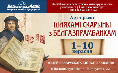 Международный выставочный проект "Дорогами Скорины с Белгазпромбанком", приуроченный к 500-летию белорусского книгопечатания, проходит в городах, связанных с жизненным путем белорусского и восточнославянского первопечатника Франциска Скорины. Отправной точкой турне стал Вильнюс, где выставка работала с 4 мая по 4 июня 2017 года в Национальном музее "Дворец великих князей литовских". После демонстрации в Полоцке экспозиция отправится в Калининград (Кенигсберг), где в 1529-1530 годах Скорина жил по приглашению прусского герцога Альбрехта Бранденбургского.