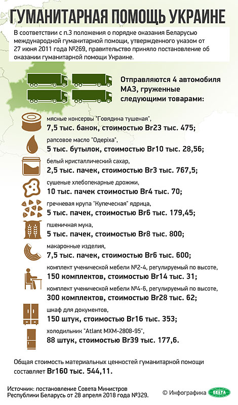 Как сообщалось, Советом Министров Министерству по чрезвычайным ситуациям, Министерству промышленности, "Белгоспищепрому", Гродненскому и Витебскому облисполкомам поручено обеспечить отпуск и оформление материальных ценностей для оказания гуманитарной помощи Украине на общую сумму более Br160 тыс. В перечень вошли консервы, масло рапсовое, сахар, дрожжи, крупа гречневая, мука пшеничная, макаронные изделия, комплекты ученической мебели, шкафы для документов и холодильники.