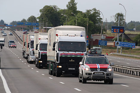 Спасатели сопровождают груз, в пути по Беларуси с ними следуют сотрудники органов внутренних дел. Ожидается прибытие колонны на границу.