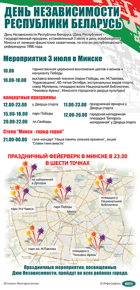 В этом году праздничные мероприятия в День Независимости по традиции пройдут по всей стране. В Минске 3 июля пройдет множество мероприятий, в которых смогут принять участие жители и гости столицы.