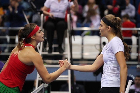 11 февраля, Минск /Корр. БЕЛТА/. Белорусские теннисистки сравняли счет в четвертьфинальном матче Кубка Федерации с командой Германии - 2:2, сообщает корреспондент БЕЛТА.