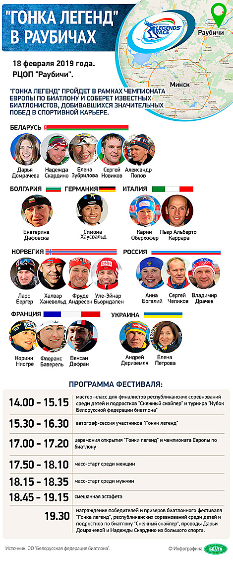 Церемония открытия "Гонки легенд" и открытого чемпионата Европы по биатлону начнется на стадионе в "Раубичах" в 17.00. В 17.50 состоится масс-старт среди женщин, а в 18.15 выступят мужчины. Заключительным забегом и одним из самых интересных станет смешанная эстафета, которая начнется в 18.45. Завершится спортивный праздник в 19.30 награждением победителей и призеров биатлонного фестиваля "Гонка легенд", республиканских соревнований среди детей и подростков по биатлону "Снежный снайпер", а также состоятся проводы Дарьи Домрачевой и Надежды Скардино из большого спорта.