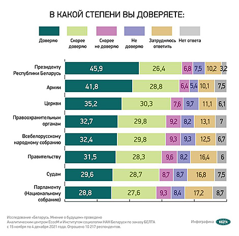 Уровень доверия иным государственным и общественным институтам выглядит следующим образом: армии - 70,6%, церкви - 65,5%, правоохранительным органам - 62,5%, правительству - 59,8%, судам - 58,3%, парламенту (Национальному собранию Республики Беларусь) - 56,4%.