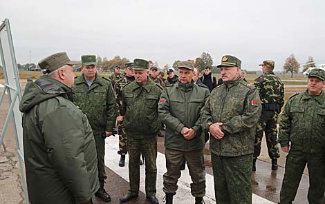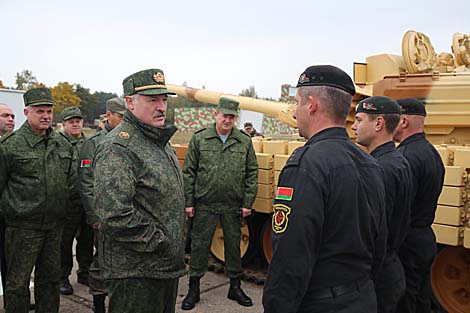 5 октября, Ивацевичский район /Владимир Матвеев - БЕЛТА/. Президент Беларуси Александр Лукашенко объяснил, почему была поставлена задача создавать в стране собственные новые образцы вооружения и военной техники, а также осваивать глубокую модернизацию уже имеющейся. Соответствующие заявления сделаны на полигоне в Ивацевичском районе в ходе осмотра современных образцов такого оружия и техники, передает корреспондент БЕЛТА.