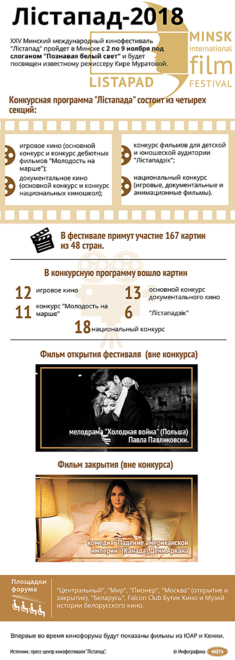 ХХV Минский международный кинофестиваль "Лістапад-2018" пройдет в белорусской столице с 2 по 9 ноября. Его география широка: 48 стран ближнего и дальнего зарубежья. Впервые во время кинофорума будут показаны фильмы из ЮАР и Кении. В основной конкурс игрового кино войдут 12 фильмов, документалистику представят 13 картин, 11 дебютных работ продемонстрируют во время конкурса "Молодость на марше". Кроме того, по традиции пройдут внеконкурсные показы. Общее число всех фильмов составит 167, которые покажут на основных площадках - кинотеатрах "Центральный", "Мир", "Пионер", "Москва", "Беларусь", Falcon Club Бутик Кино и Музей истории белорусского кино.