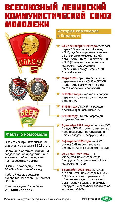 29 октября, Минск /Корр. БЕЛТА/. Сегодня, 29 октября, Ленинскому комсомолу исполняется 100 лет. В этот день в 1918 году на I Всероссийском съезде союзов рабочей и крестьянской молодежи в Москве был образован Российский коммунистический союз молодежи (РКСМ).