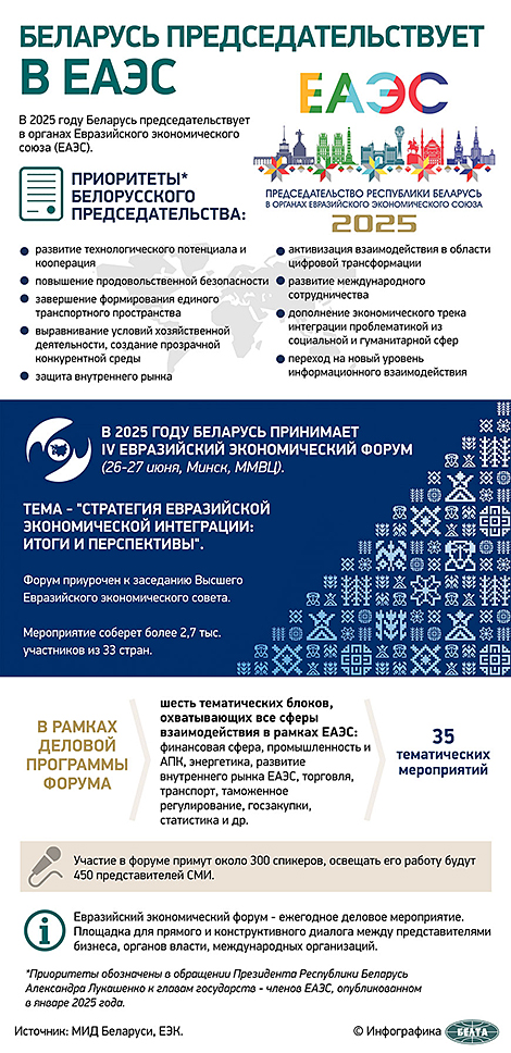 Александр Лукашенко напомнил, что в текущем году Беларусь председательствует в органах ЕАЭС. А Евразийский экономический форум - самая масштабная открытая дискуссионная площадка объединения.
