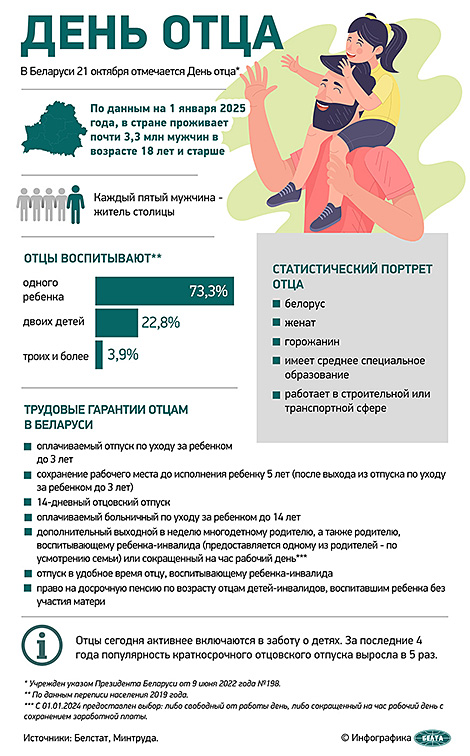 21 октября, Минск /Корр. БЕЛТА/. Президент Беларуси Александр Лукашенко поздравил соотечественников с Днем отца. Об этом БЕЛТА сообщили в пресс-службе белорусского лидера.