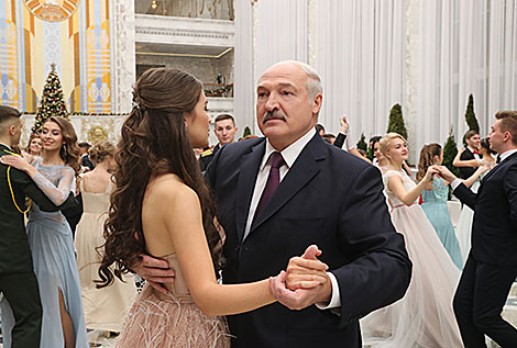 Открывая бал, глава государства признался, что рад видеть во Дворце Независимости талантливых, нарядных и одухотворенных молодых людей. "Благодаря вам этот всегда строгий зал Дворца Независимости сегодня становится неофициальным, нарядным и торжественным", - констатировал Александр Лукашенко.