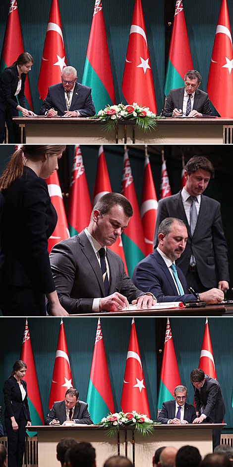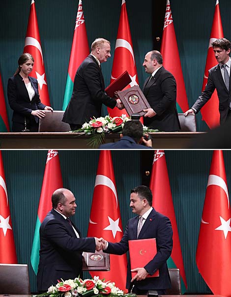 По итогам переговоров президентов Беларуси и Турции стороны подписали пакет документов. Были заключены межправительственное соглашение о сотрудничестве в сфере образования, меморандум о сотрудничестве между министерствами юстиции, меморандум о взаимопонимании между Государственным военно-промышленный комитетом Беларуси и Президиумом оборонной промышленности Администрации Президента Турции.
