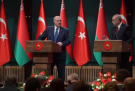16 апреля, Анкара /Михаил Матиевский - БЕЛТА/. Белорусско-турецкие отношения выходят на новый уровень. Об этом Президент Беларуси Александр Лукашенко заявил сегодня журналистам по итогам переговоров с Президентом Турции Реджепом Тайипом Эрдоганом, передает корреспондент БЕЛТА.