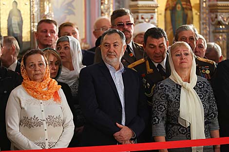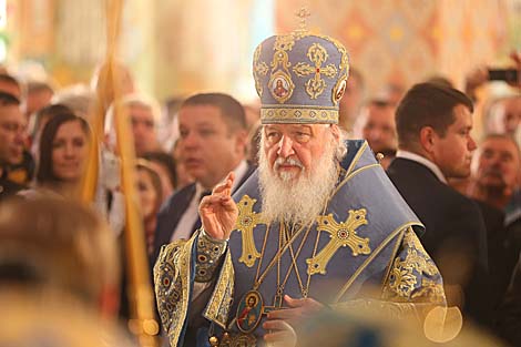Патриарх Кирилл отметил, что был здесь еще во время строительства храма и сегодня с особым чувством переступил его порог. "Тогда было трудно представить то великолепие, которое сегодня открывается нашему взору. Это достойный мемориальный храм, посвященный всем святым и памяти погибших защитников нашего Отечества, земли белорусской. Мы знаем, сколь суровой была война здесь, какого мужества требовало сопротивление мирных граждан нашествию иноплеменников. Мы знаем, какую огромную роль партизанская борьба сыграла в приближении общей победы над страшным врагом и как много людей погибло", - сказал он.
