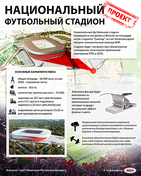 Александр Лукашенко в этой связи отметил, что футбол в Беларуси является народным видом спорта и спортом номер один, которым занимается больше всего людей. "И не иметь чисто футбольного национального стадиона, где будет выступать национальная сборная, играть лучшие наши клубы, проводиться матчи международного уровня, это не гоже", - считает глава государства.