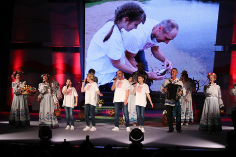 Гродненскую область представили Олег и Ирина Сидор из агрогородка Лунно, которым на сцене помогали не только дочки Мария и Дарья, но и представители старшего поколения - бабушка с дедушкой. Они с первых минут показали себя людьми земли, рачительными хозяевами, которые думают о будущих поколениях, стараются делать родной край чище и красивее.