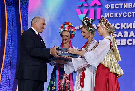 Но и сам Александр Лукашенко не остался без подарка. Организаторы форума, чтобы поблагодарить его за помощь в сохранении фестиваля, который сегодня объединяет многие народы, подарили Президенту пояс-оберег. Именно такой пояс был главным даром мужчине у славянских народов.