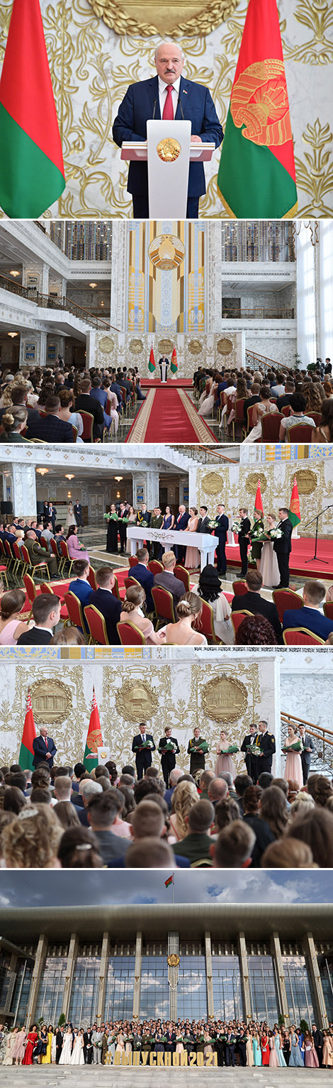 "Глядя сегодня на вас - красивых, молодых и уже успешных, - я испытываю чувство гордости за Беларусь, - обратился глава государства к выпускникам. - За тех, кто создавал независимую страну, в которой наши дети получают достойное образование, а лучшие из лучших отмечают свои первые успехи на столь высоком уровне".