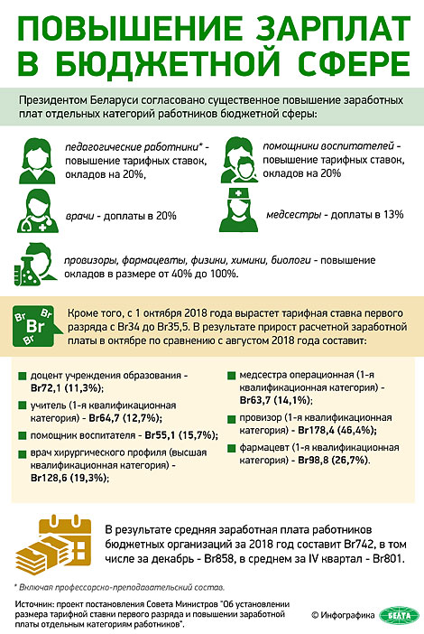 Кроме того, предусматривается повышение с 1 октября 2018 года тарифной ставки первого разряда с Br34 до Br35,5 работникам бюджетной сферы в целом.