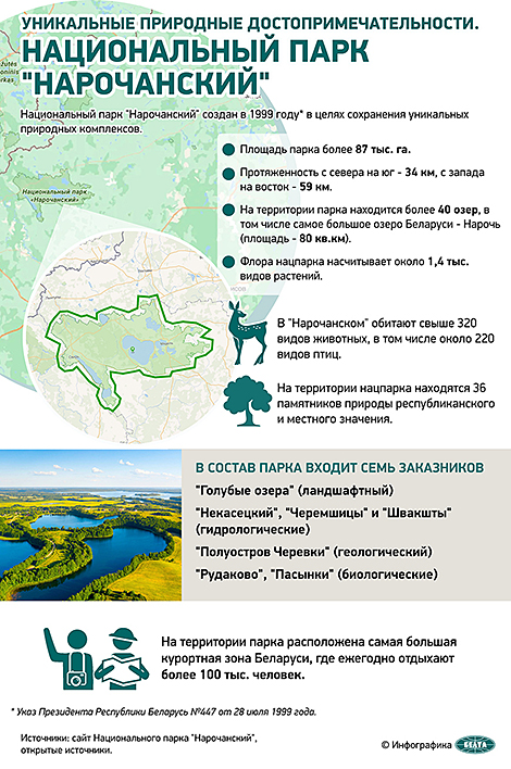 Экологические проблемы с течением времени лишь усугублялись, браконьерство расцветало. Чтобы остановить нарастание негативных тенденций и сохранить уникальный природный комплекс, указом Президента в 1999 году на площади более 87 тыс. га создается национальный парк "Нарочанский" - сегодня один из четырех национальных парков Беларуси. Практически 20% его территории занимают озера. Всего их здесь около полусотни.